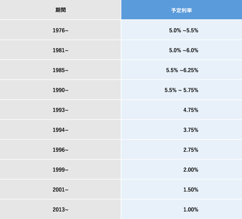 1976年頃から1995年くらいまでが、予定利率が高いです。