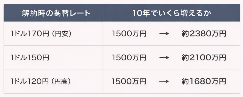 加入時の為替レートが1ドル150円だった場合、10年後の解約時の為替レートの変化で、日本円がいくらになるかを見てみましょう。