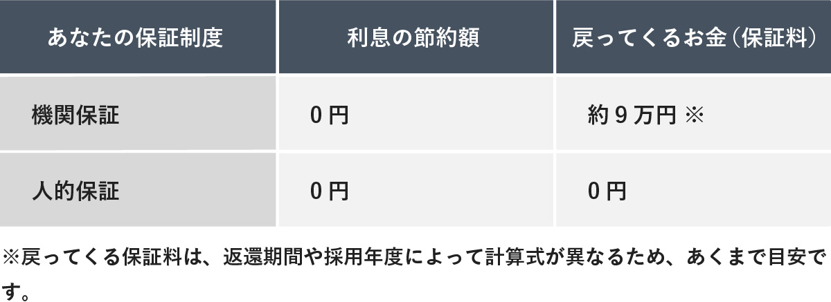 続いて、利息がつかない「第一種奨学金」の場合を見てみましょう。借りた時に機関保証を選んだかどうかで、結果が大きく変わります。