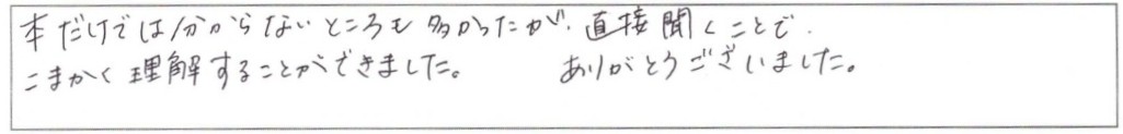 本だけでは分からないところも多かったが、直接聞くことでこまかく理解することができました。ありがとうございました。
