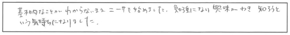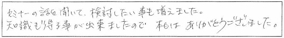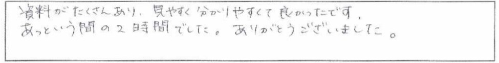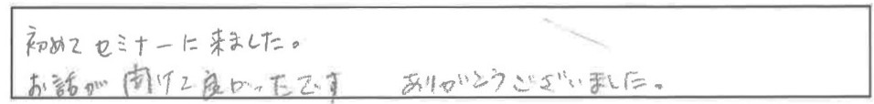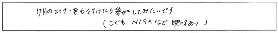 マネーの基礎知識&NISAスタート講座 ~マネー初心者がNISAで成功するための秘訣~セミナーの話を聞いて、検討したい事も増えました。知識も得る事が出来ましたので本日はありがとうございました。