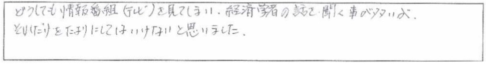 マネーの基礎知識&NISAスタート講座 ~マネー初心者がNISAで成功するための秘訣~どうしても情報番組(テレビ)を見てしまい、経済学者の話を聞く事が多いが、それだけをたよりにしてはいけないと思いました。