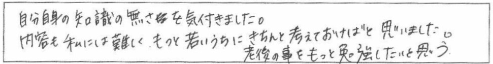 60歳からのマネープラン基礎講座(老後資金・終活・相続)間口が広くて、理解するのが大変でしたが、大事な内容であるという認識を持てた。