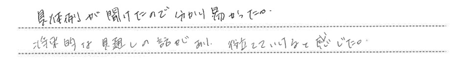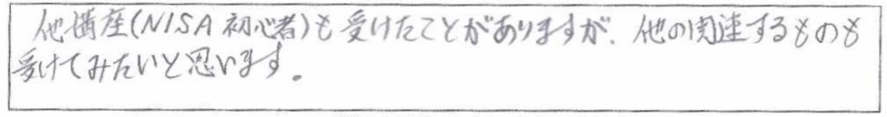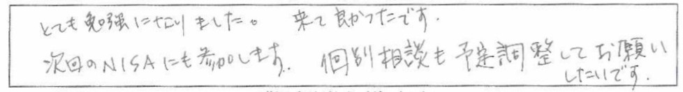 老後資金遺言介護認知症相続60歳からのマネープラン基礎講座(老後資金・終活・相続)とても勉強になりました。来て良かったです。次回のNISAにも参加します。個別相談も予定調整してお願いしたいです。