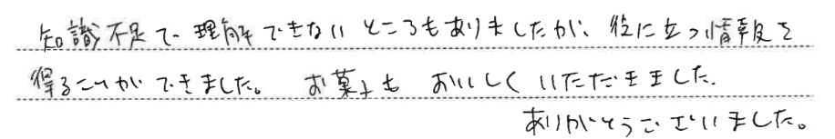 医療・がん保険保険の選び方介護認知症松山クライアントセミナー【公的介護、医療制度の仕組みとホケンを学ぼう】知識不足で理解できないところもありましたが、役に立つ情報を得ることができました。お菓子もおいしくいただきました。ありがとうございました。