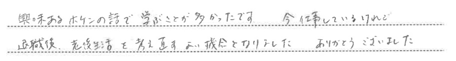 医療・がん保険保険の選び方介護認知症松山クライアントセミナー【公的介護、医療制度の仕組みとホケンを学ぼう】興味あるホケンの話で学ぶことが多かったです。今仕事しているけれど退職後、老後生活を考え直すよい機会となりました。ありがとうございました。