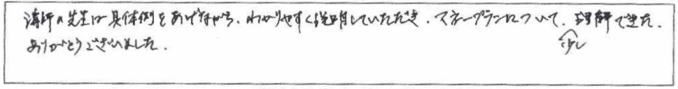 老後資金遺言介護認知症相続60歳からのマネープラン基礎講座(老後資金・終活・相続)講師の先生に具体例をあげながら、わかりやすく説明していただき、マネープランについて、少し理解できた。ありがとうございました。