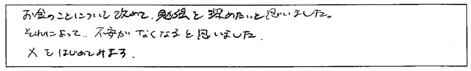 クライアントセミナー(高知)お金のことについて改めて勉強を深めたいと思いました。それによって、不安がなくなると思いました。Xをはじめてみます。