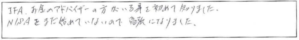 IFAiDeCoNISA企業型確定拠出年金(401k)投資信託NISA・iDeCoのメリット&デメリット初心者セミナーは2回目の参加ですが、忘れていた事や最近の経済状況など丁寧に解説して頂きよく理解することが出来ました。ありがとうございました。   担当FPよりコメントありがとうございます。 担当FPよりコメントありがとうございます。
