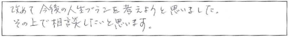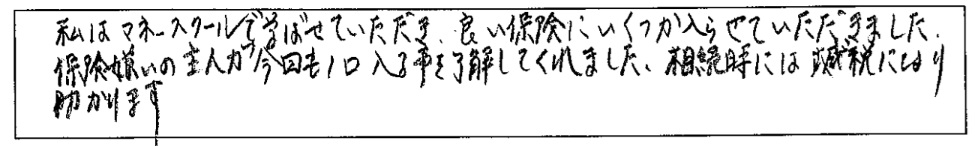 クライアントセミナー(高知)私はマネースクールで学ばせていただき、良い保険にいくつか入らせていただきました。保険嫌いの主人が今回も1口入る事を了解してくれました。相続時には減税になり助かります。