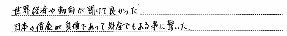 クライアントセミナー(金沢)世界経済や動向が聞けて良かった。日本の借金が負債であって財産でもある事に驚いた。