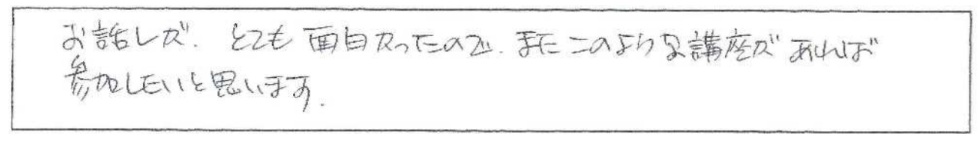 老後資金遺言介護認知症相続60歳からのマネープラン基礎講座(老後資金・終活・相続)お話しが、とても面白かったので、またこのような講座があれば参加したいと思います。
