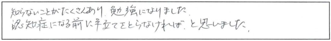 老後資金遺言認知症投資信託相続65歳からのマネープラン基礎講座(老後資金・終活・相続)知らないことがたくさんあり、勉強になりました。認知症になる前に手立てをとらなければ、と思いました。