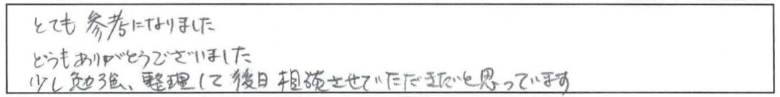 本アンケートでは,個別相談を希望しないとしていますが,スケジュールを確認して,個別相談など検討したいと思います。