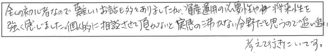 担当FPよりセミナーだけで、100%理解するのは難しいと思います。疑問に思ったことや、わからなかった点は個別に聞いてもらえればと思います。