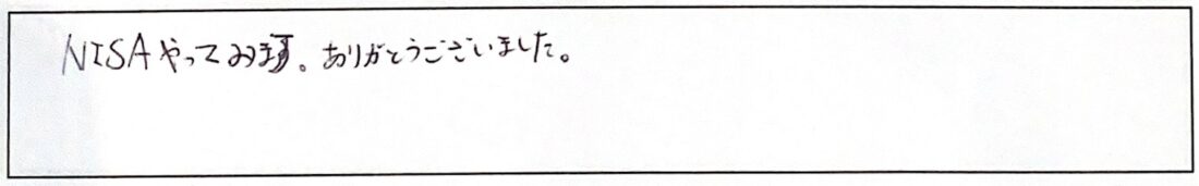 保険の選び方NISA投資信託教育資金の貯め方&殖やし方基本がわからなかったので、わかりやすい説明で楽しく時間があっと言う間でした。また何かセミナーがあれば参加させていただきたいと思います。ありがとうございました。