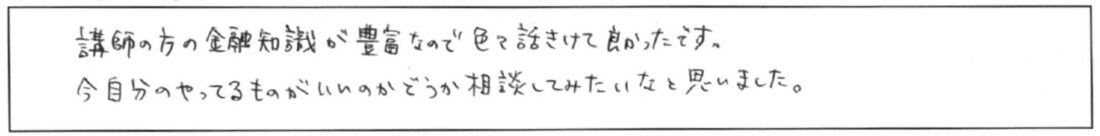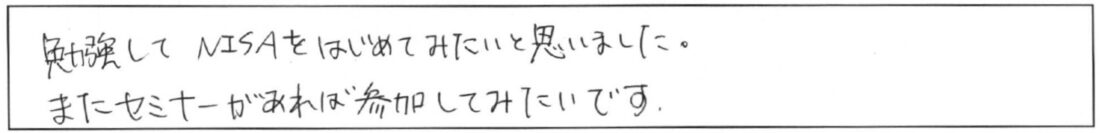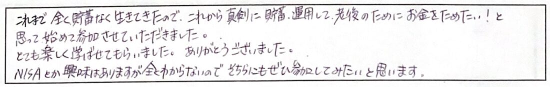 とても楽しく学ばせてもらいました。ありがとうございました。NISAとか興味はありますが全くわからないのでそちらにもぜひ参加してみたいと思います。