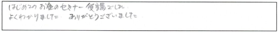 老後資金遺言介護認知症相続65歳からのマネープラン基礎講座(老後資金・終活・相続)はじめてのお金のセミナー受講でした。よくわかりました。ありがとうございました。