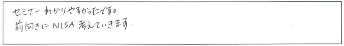 老後資金NISA投資信託初心者向けマネープラン基礎講座【NISA活用術】本日は有意義な講座を開催いただきありがとうございました。