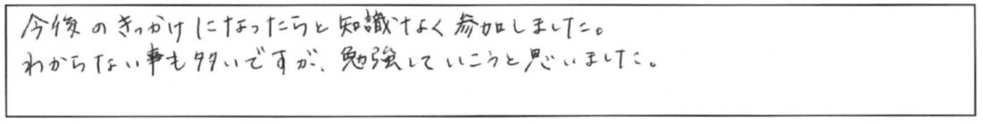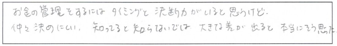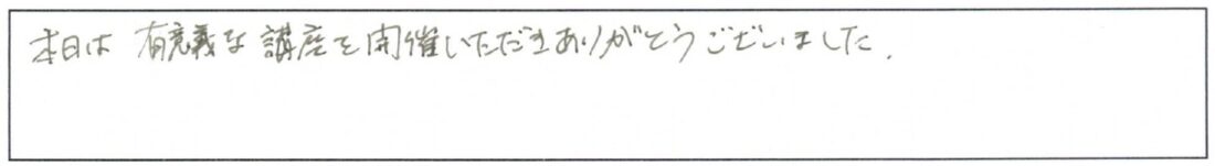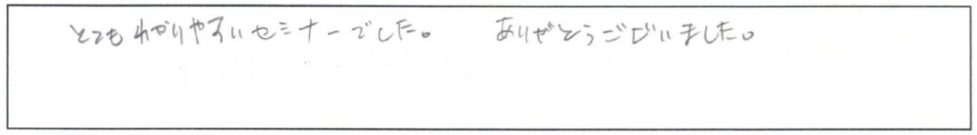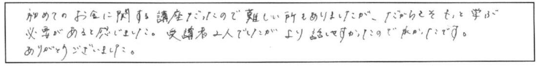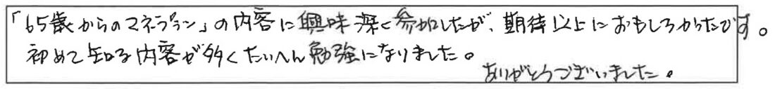 老後資金遺言介護認知症相続65歳からのマネープラン基礎講座(老後資金・終活・相続)「65歳からのマネープラン」の内容に興味深く参加したが、期待以上におもしろかったです。初めて知る内容が多くたいへん勉強になりました。ありがとうございました。