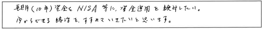 担当FPより今の時代、資産運用について知識を増やすことは大切ですね。その知識をもとに実践してみることをおすすめします。 -