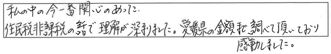 老後資金遺言介護認知症相続65歳からのマネープラン基礎講座(老後資金・終活・相続)私の中の今一番関心のあった、住民税非課税の話で理解が深まりました。愛媛県の金額まで調べて頂いており感動しました。