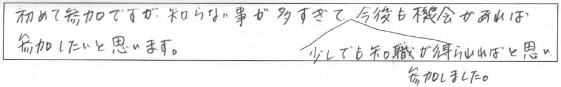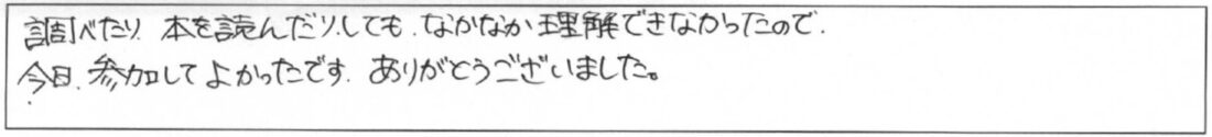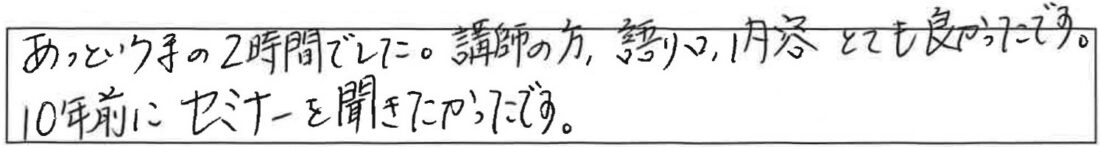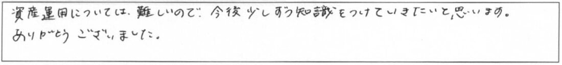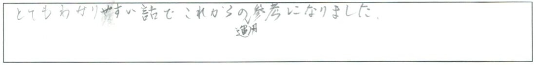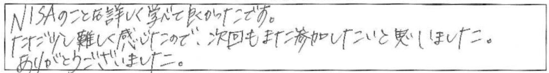 老後資金介護認知症65歳からのマネープラン基礎講座 ~老後の資産運用と終活を考える~いろいろなお話をされていて、興味深かったです。ありがとうございました。