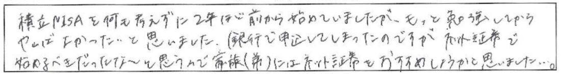 IFAiDeCoNISA企業型確定拠出年金(401k)投資信託初心者でもわかるNISA・iDeCo徹底解説セミナー積立NISAを何も考えずに2年ほど前から始めていましたが、もっと勉強してからやればよかったと思いました。銀行で申込してしまったのですがネット証券で始めるべきだったなーと思うので家族(弟)にはネット証券をおすすめしようかと思いました…。