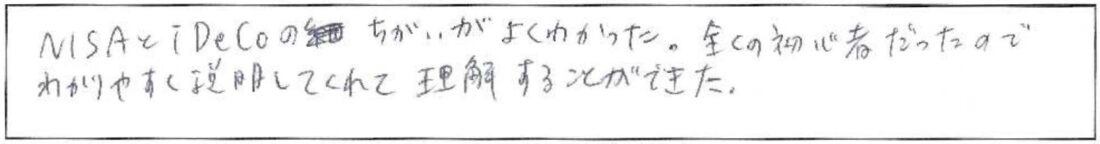 IFAiDeCoNISA企業型確定拠出年金(401k)投資信託初心者でもわかるNISA・iDeCo徹底解説セミナー大変わかりやすく、ていねいに説明して頂き、理解が進みました。ありがとうございました。