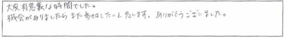 老後資金遺言介護認知症相続60歳からのマネープラン基礎講座(老後資金・終活・相続)大変有意義な時間でした。機会がありましたらまた参加したいと思います。ありがとうございました。