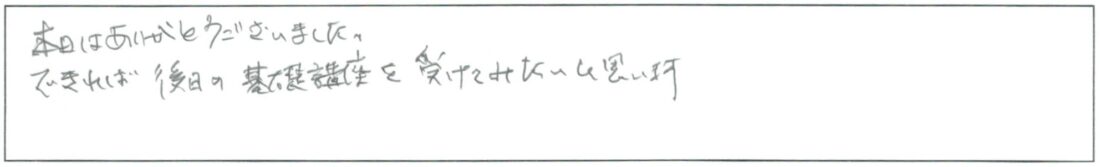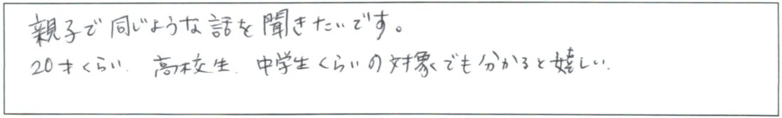 成年後見制度家族信託介護認知症相続後見制度・家族信託のしくみ家族信託について安易に考えていて、認識の間違いに気づきました。先生の講演内容が大変分かりやすく、自分で検討できる様々な方法を知ることができました。資料を読み返したり、再度セミナーをお聞きしたいと思います。ありがとうございました。