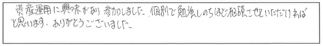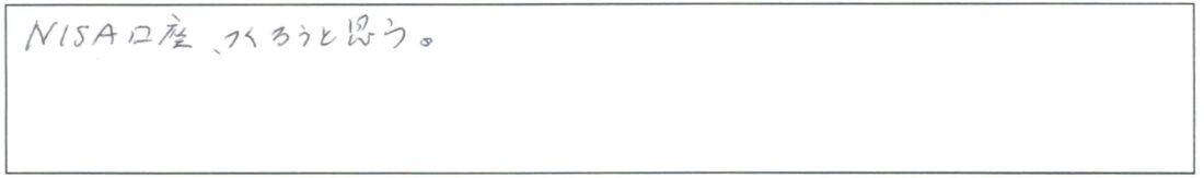 老後資金IFAiDeCoNISA投資信託セカンドライフ準備セミナー大変親しみやすく、講師の方が参加者に寄り添った話し方をしていただけて、いろんな気づきがありました。資料とライフプラン表も頂きたいです。預金ばかりでなくなんとかNISAを始めたいと思っています。