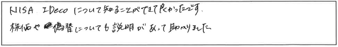 IFAiDeCoNISA企業型確定拠出年金(401k)投資信託初心者でもわかる新NISA徹底解説講座 ~NISA・iDeCoのメリット&デメリット~資産運用に興味があり参加しました。個別で勉強しのちほど相談させていただければと思います。ありがとうございました。