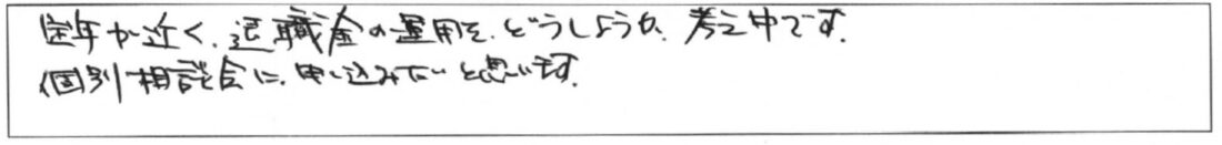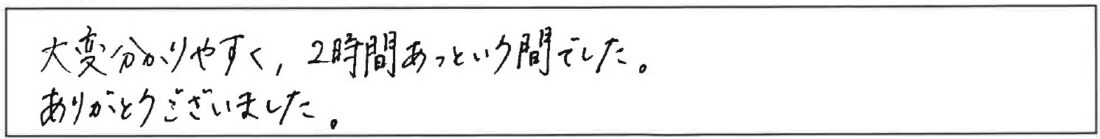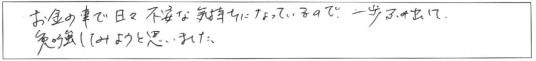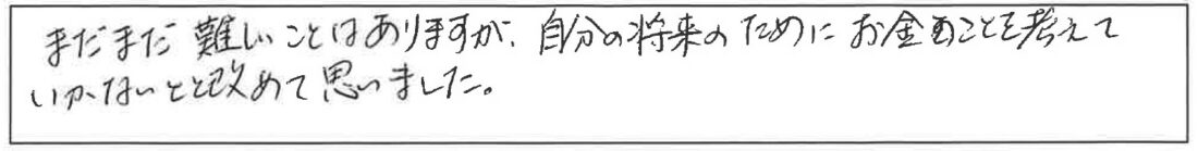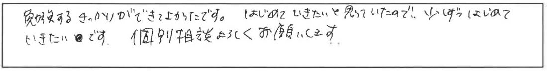 まだまだ、勉強不足でわからない単語も多くありましたので、基礎講座を受講してから個人相談を利用しようと思います。 -