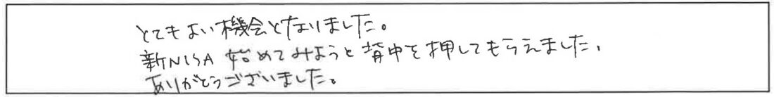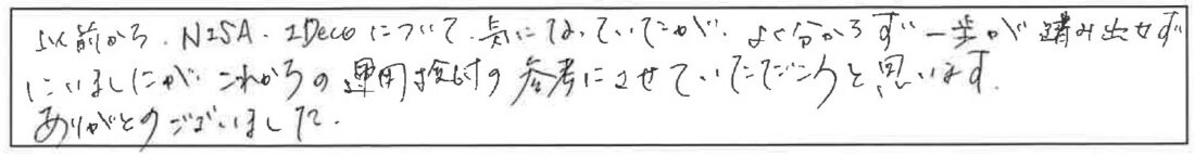 担当FPよりコメントありがとうございます。ネット記事や本だけではよく分からなかったが、セミナーを聞くと理解できましたとのお声はよくいただきます。相談ではさらに理解が深まりますので、楽しみにしていただければと思います。 -