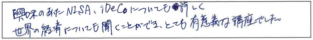IFAiDeCoNISA企業型確定拠出年金(401k)投資信託初心者でもわかる新NISA徹底解説講座 ~NISA・iDeCoのメリット&デメリット~興味のあったNISA、iDeCoについても詳しく世界の経済についても聞くことができ、とても有意義な講座でした。