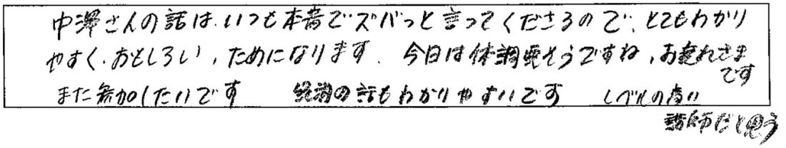今日は体調悪そうですね、お疲れ様です。また参加したいです。経済の話もわかりやすいです。レベルの高い講師だと思う。