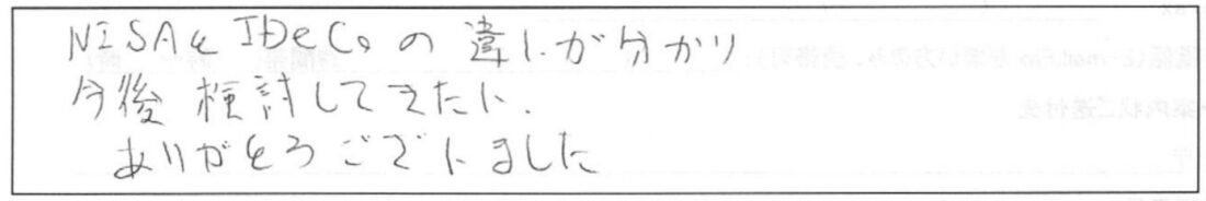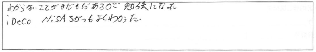 保険の選び方老後資金資産運用初心者超初心者向けマネープラン基礎講座 ~資産運用の基礎をマスター!~とても楽しかったです。また金融企画あれば参加したいです。
