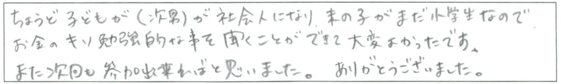 保険の選び方老後資金資産運用初心者超初心者向けマネープラン基礎講座 ~資産運用の基礎をマスター!~ちょうど子どもが(次男)が社会人になり末の子がまだ小学生なのでお金のキソ勉強的な事を聞くことができて大変よかったです。