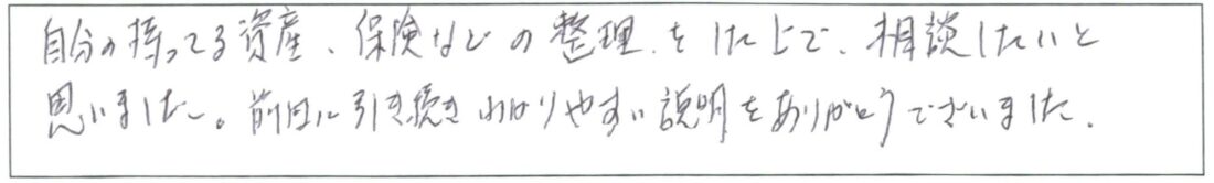 保険の選び方老後資金資産運用初心者超初心者向けマネープラン基礎講座 ~資産運用の基礎をマスター!~自分の持ってる資産、保険などの整理をした上で、相談したいと思いました。前回に引き続きわかりやすい説明をありがとうございました。