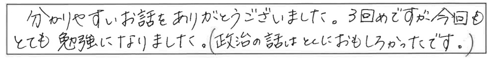 老後資金遺言介護認知症相続60歳からのマネープラン基礎講座(老後資金・終活・相続)とても分かりやすく、聞きやすいお話でした。勉強になりました。ありがとうございました。