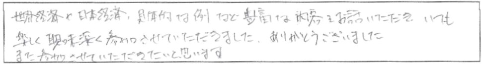 老後資金遺言介護認知症相続60歳からのマネープラン基礎講座(老後資金・終活・相続)世界経済や日本経済、具体的な例など豊富な内容をお話いただき、いつも楽しく興味深く参加させていただきました。