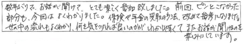 老後資金遺言介護認知症相続60歳からのマネープラン基礎講座(老後資金・終活・相続)数年ぶりで、お話が聞けて、とても楽しく参加致しました。前回、ピンとこなかった部分も、今回はよく分かりました。保険や年金の受取の方法、改めて参考になりました。世の中の流れもよくわかり、何を気を付ければ良いのかがわかりやすくてまたお話が聞けるのを楽しみにしています。