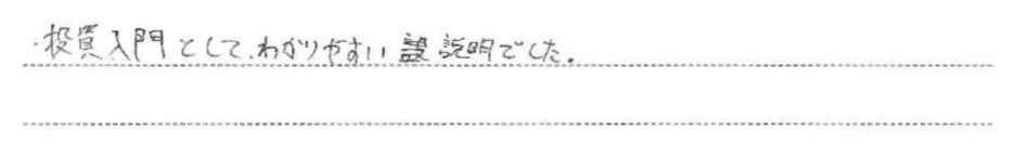 老後資金資産運用初心者自分年金を作ろうとても聴きやすい内容でした。何度聞いても忘れてしまうので繰り返し参加させていただき実践していこうと思います。ありがとうございました。