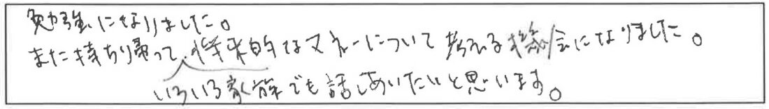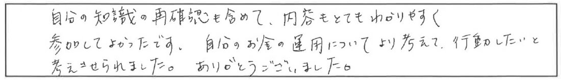 自分のお金の運用についてより考えて、行動したいと考えさせられました。ありがとうございました。