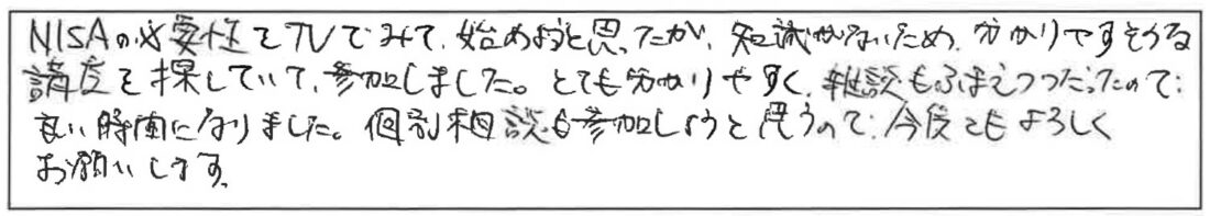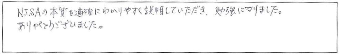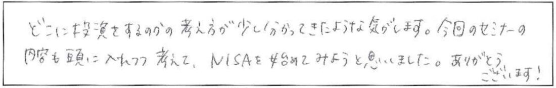 今回のセミナーの内容も頭にいれつつ考えて、NISAを始めてみようと思いました。ありがとうございます!