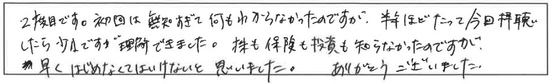 株も保険も投資も知らなかったのですが、早くはじめなくてはいけないと思いました。ありがとうございました。
