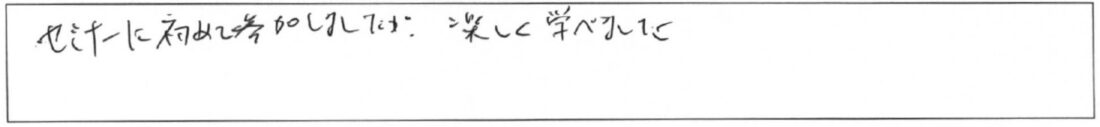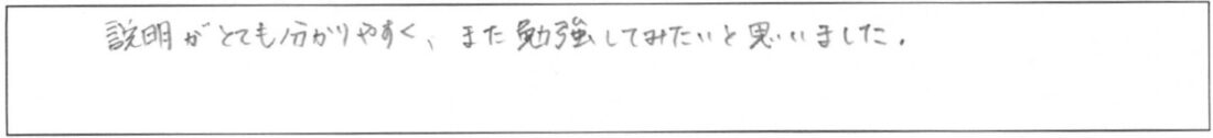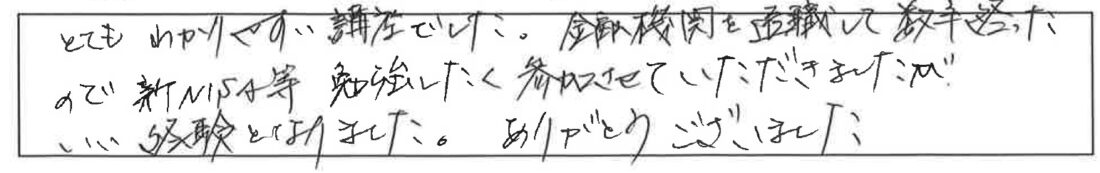 保険の選び方老後資金資産運用初心者超初心者向けマネープラン基礎講座 ~資産運用の基礎をマスター!~前回のセミナーには参加しておらず今回がはじめて参加しました。全体のなんとなくはわかったのですが、途中参加だと少し入りにくく、むずかしいと感じてしまうことがありました。講師の方はとてもユーモラスに話してくれるのできらくにききやすくてよかったです。ありがとうございました。