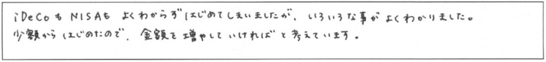 IFAiDeCoNISA企業型確定拠出年金(401k)投資信託新しいNISAマスター講座~NISA・iDeCoのメリット&デメリット~セミナーありがとうございました。受講できてよかったです。まだ分からない所もありますが、勉強していきたいと思います。