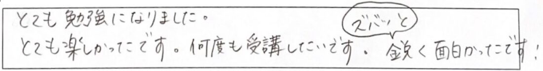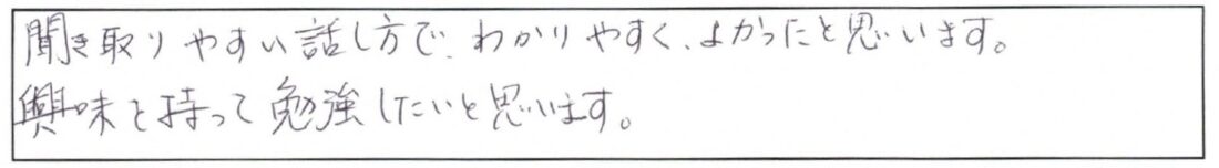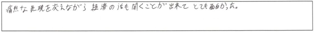 金利や為替、損益分岐点などの仕組みをよく理解していないため、もっと知っていたら理解が深まっただろうと思いました。もう少し勉強した後にもう一度受けたいと思いました。ありがとうございました。 -